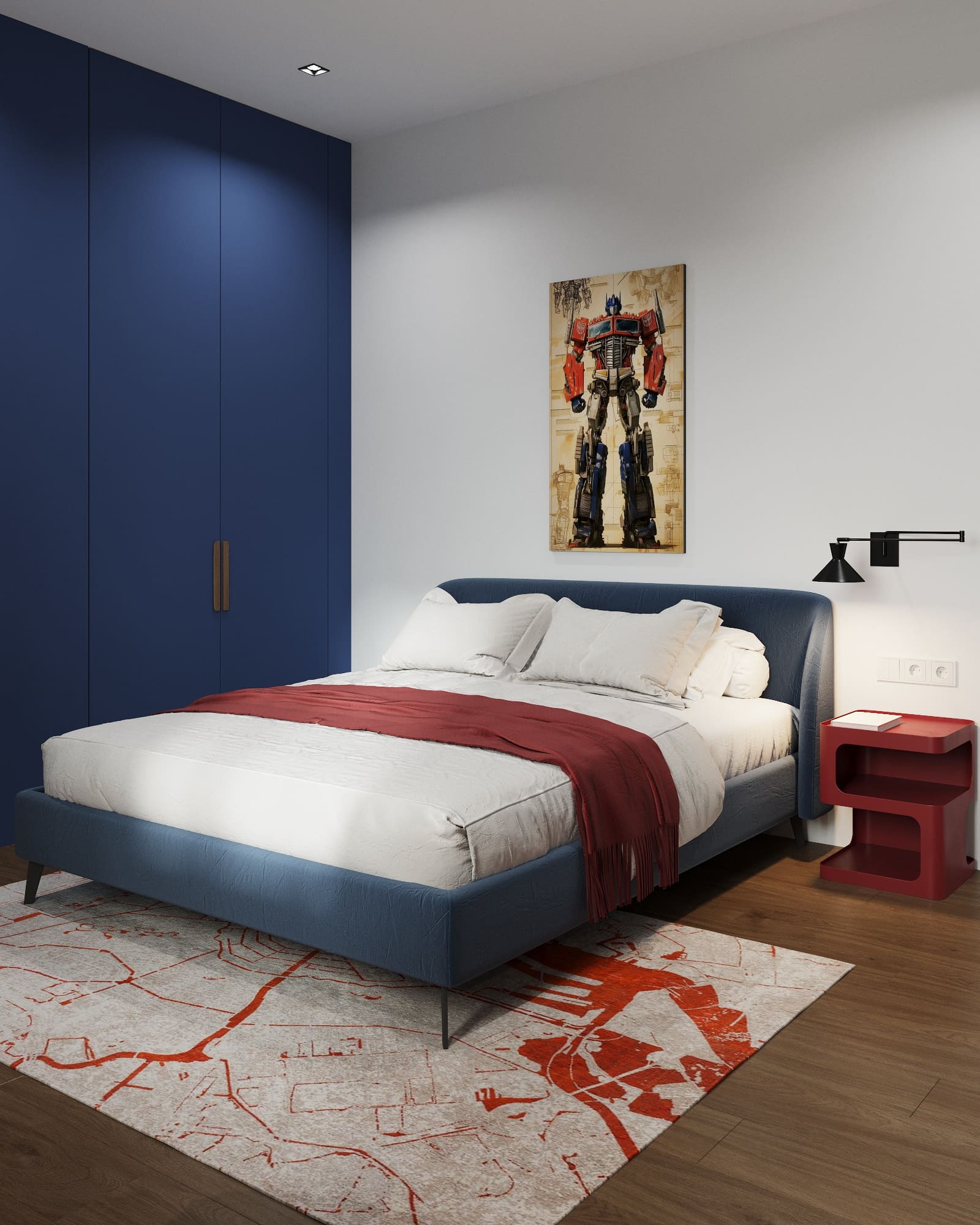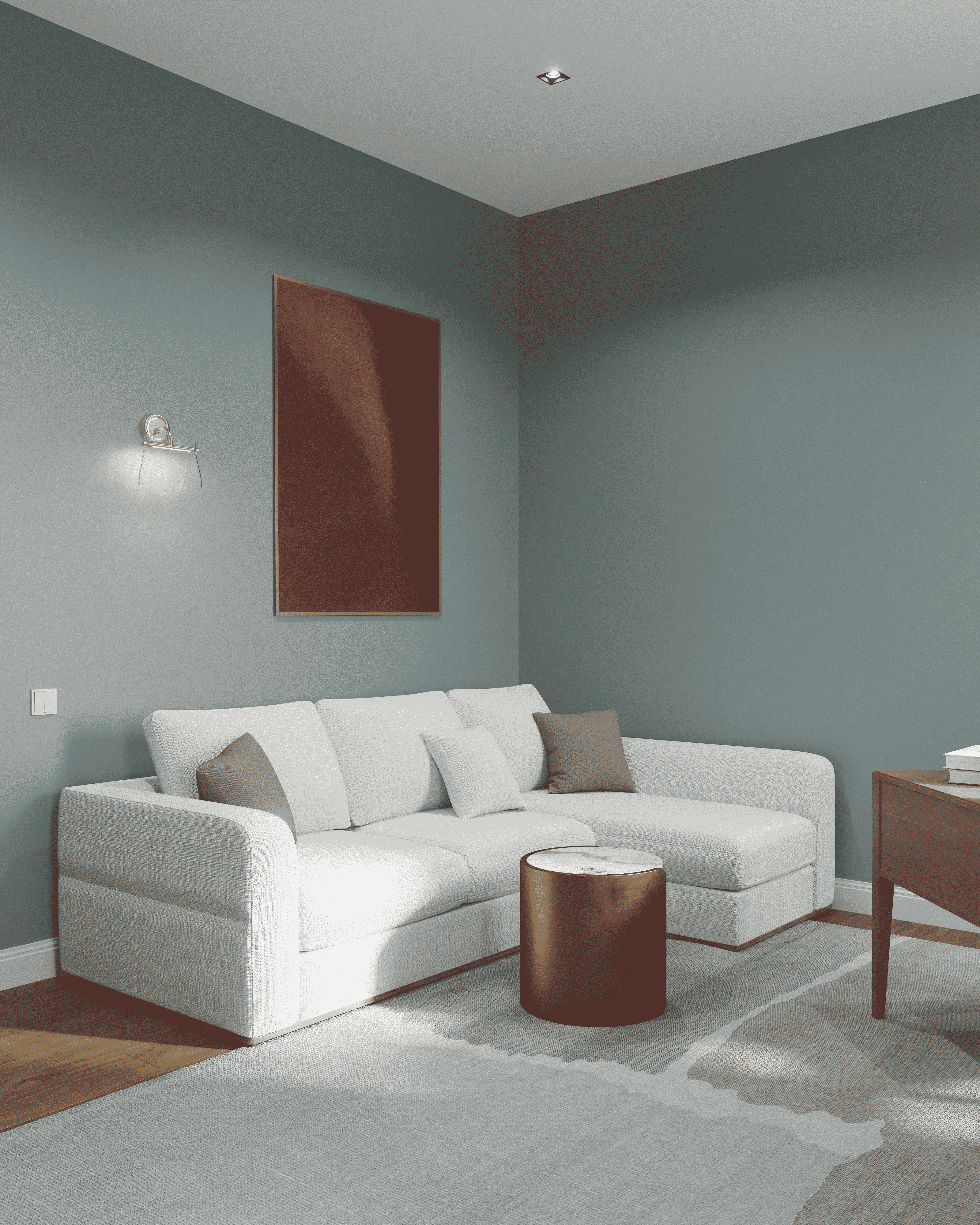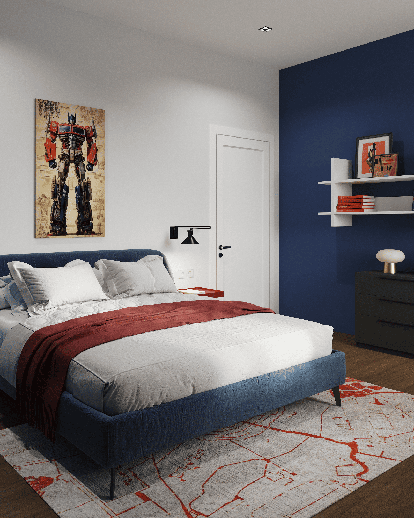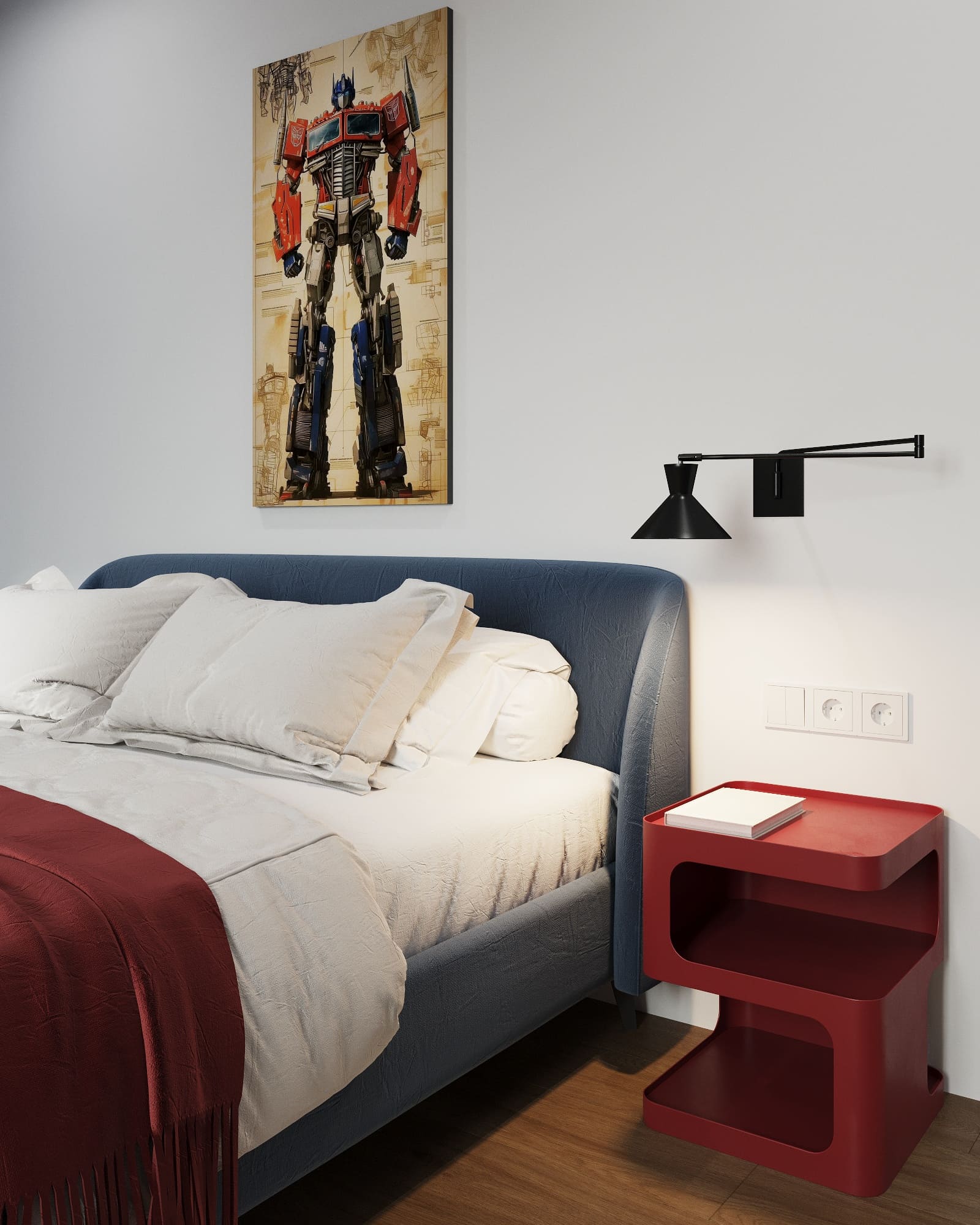 Акцентный декор вносит разнообразие и характер в пространство. Стены украшают сет миниатюрных картин и архитектурный постер, которые добавляют художественный элемент и подчеркивают стиль комнаты. Высокая лампа с мягким светом, создает уютную атмосферу и служит не только источником света, но и стильным акцентом.