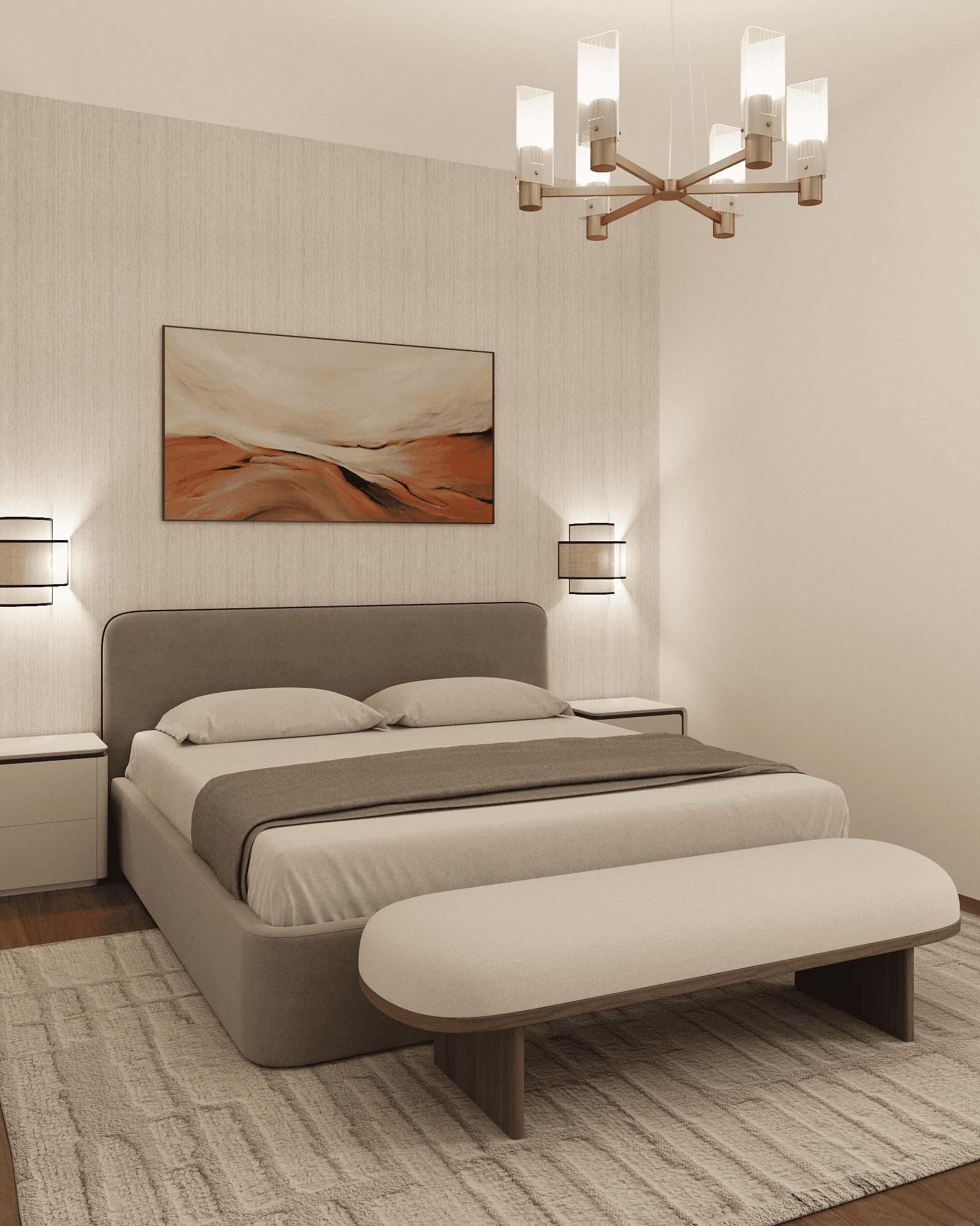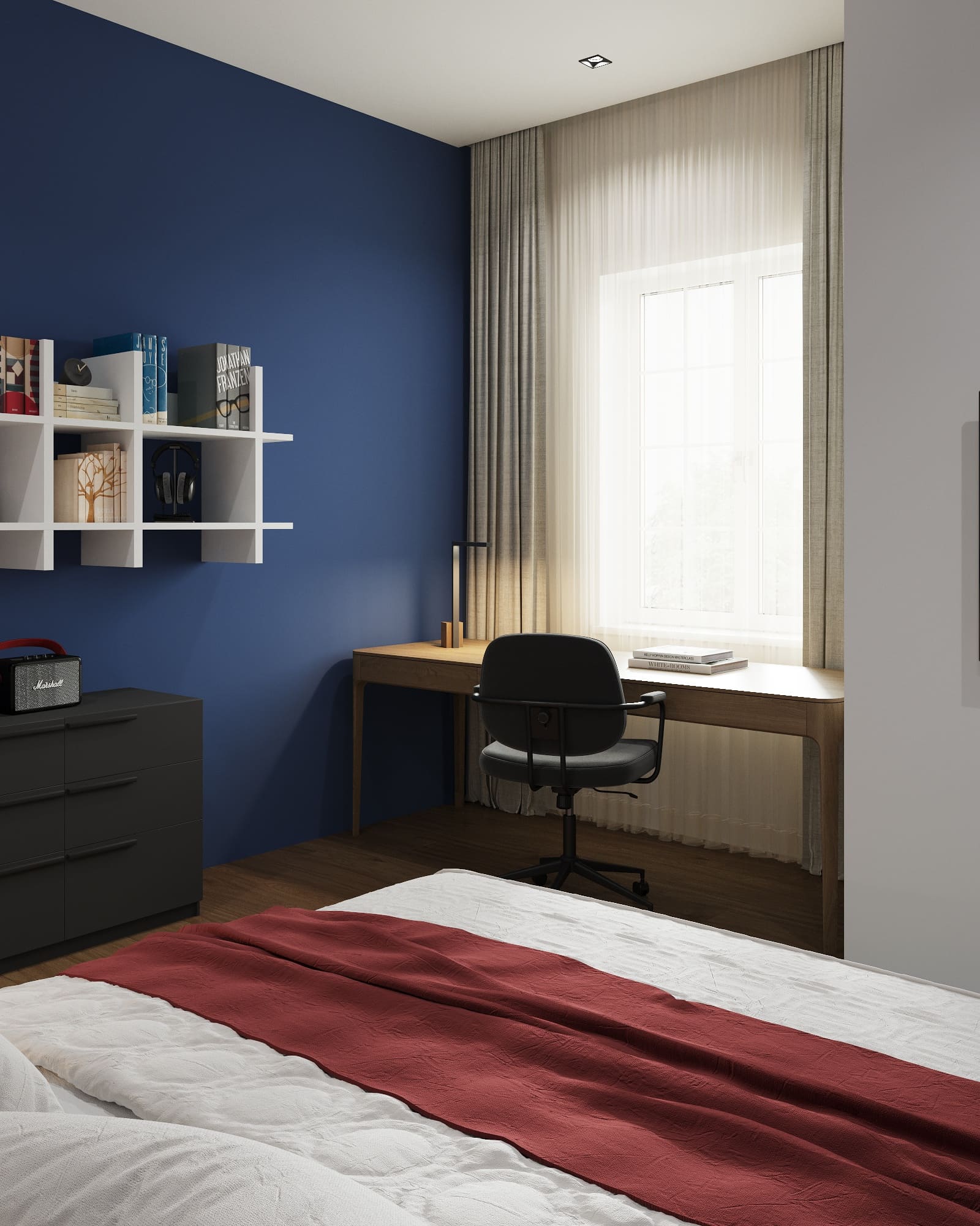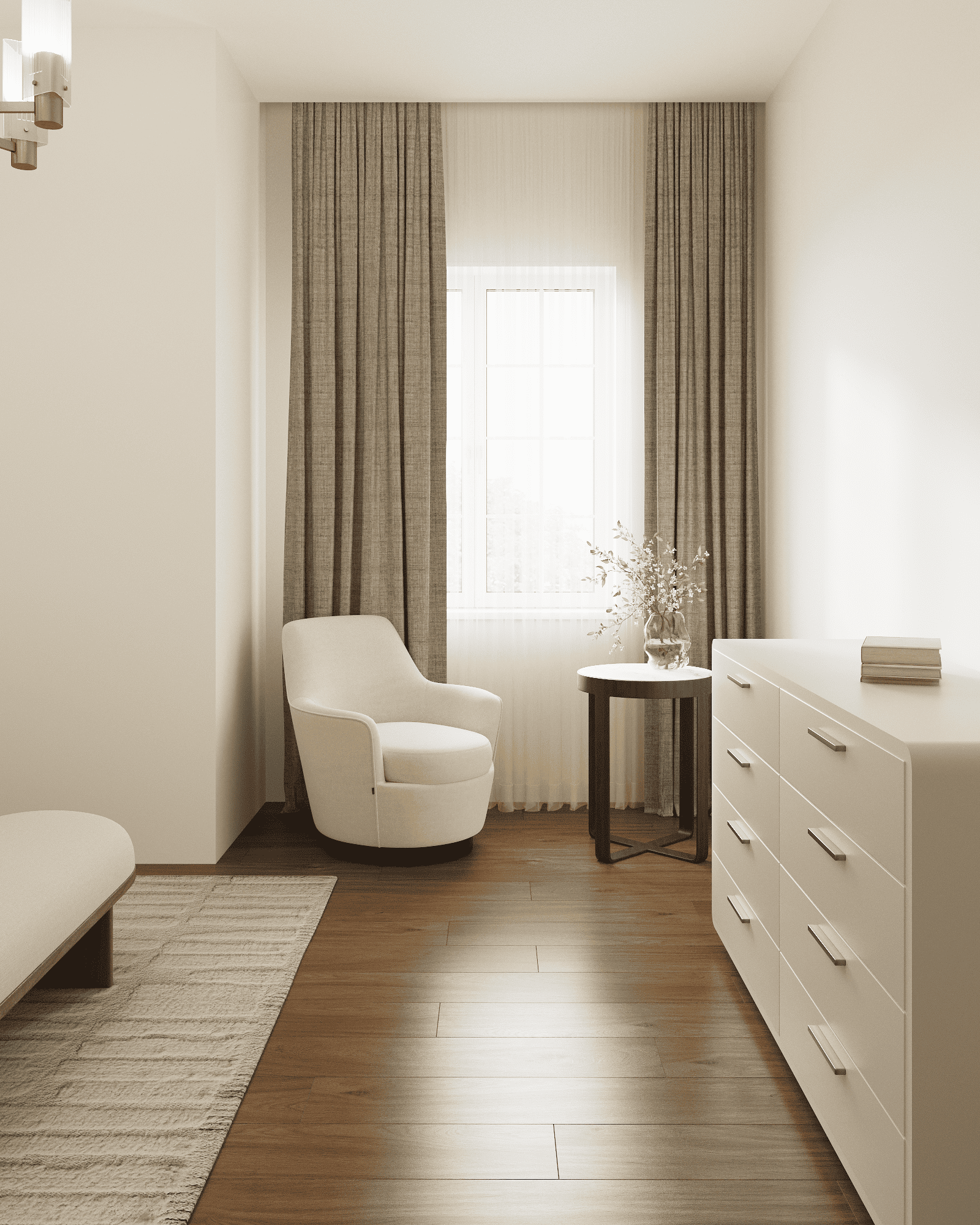 Акцентный декор вносит разнообразие и характер в пространство. Стены украшают сет миниатюрных картин и архитектурный постер, которые добавляют художественный элемент и подчеркивают стиль комнаты. Высокая лампа с мягким светом, создает уютную атмосферу и служит не только источником света, но и стильным акцентом.