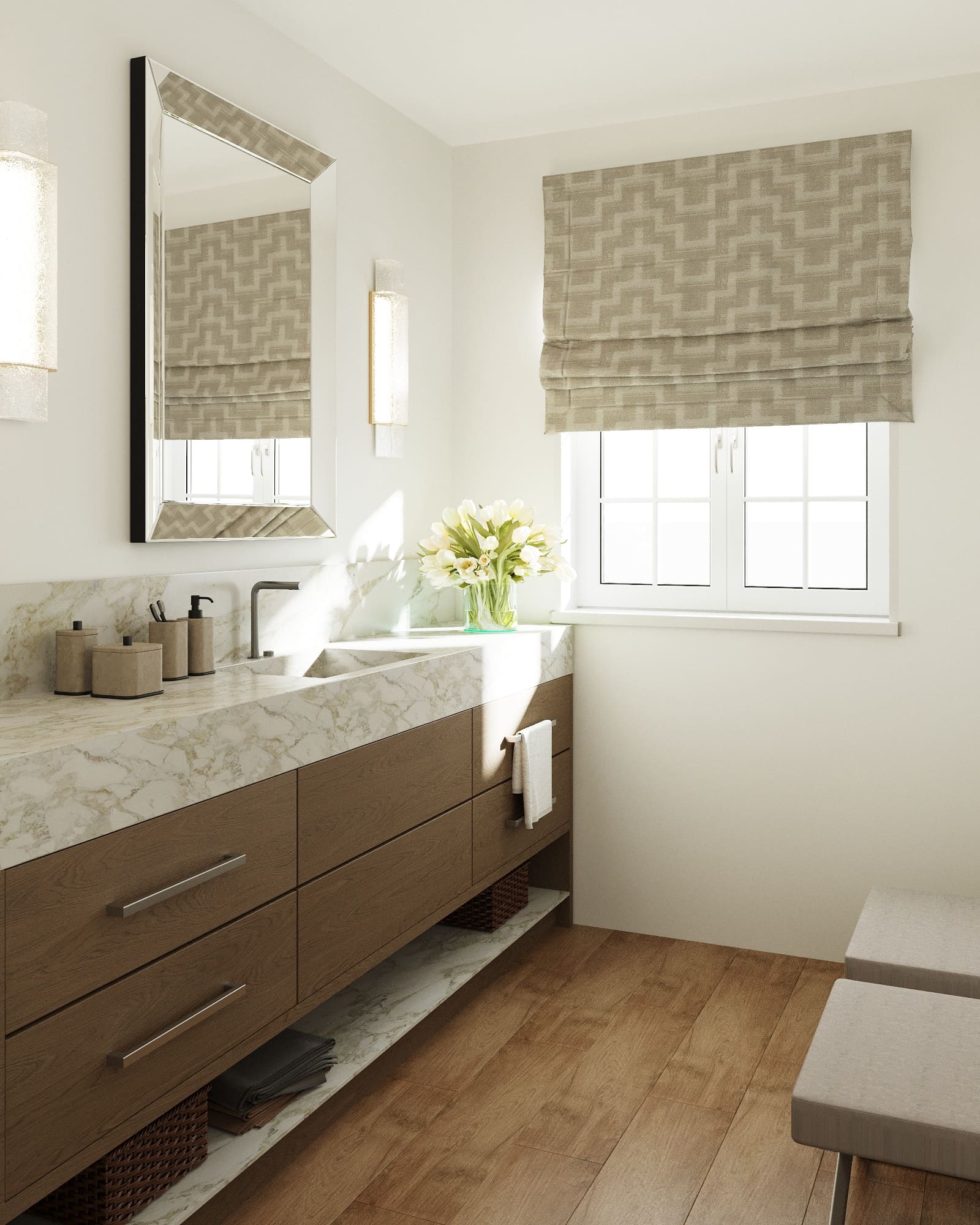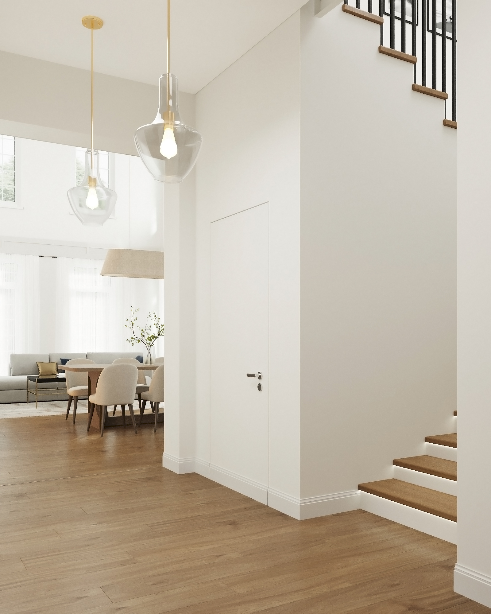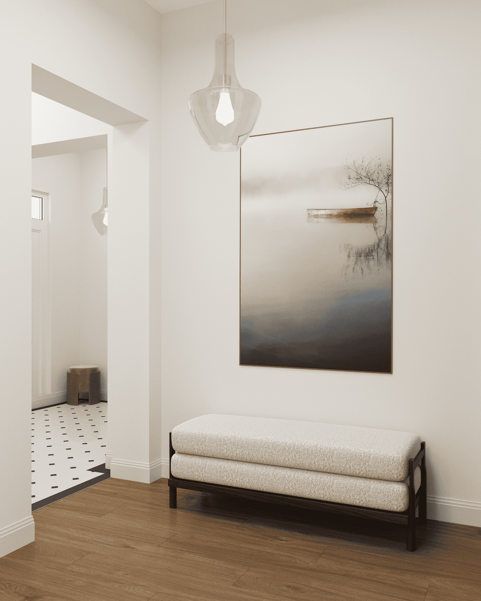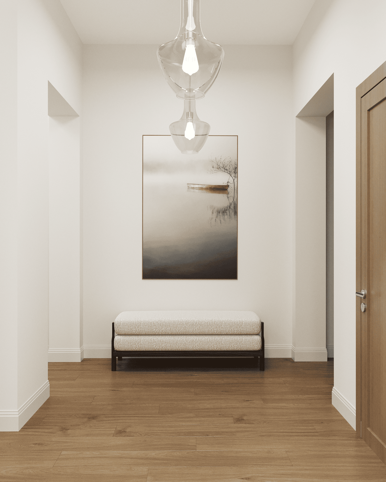 Светлые стены, деревянный пол, строгая симметрия банкетки и умиротворяющей картины с изображением лодки на спокойной глади озера создаются атмосферу порядка и покоя, в то время как подвесные светильники со теклянными абажурами ретро-формы дают стилистическую отсылку к традиционным интерьерам загородных домов.