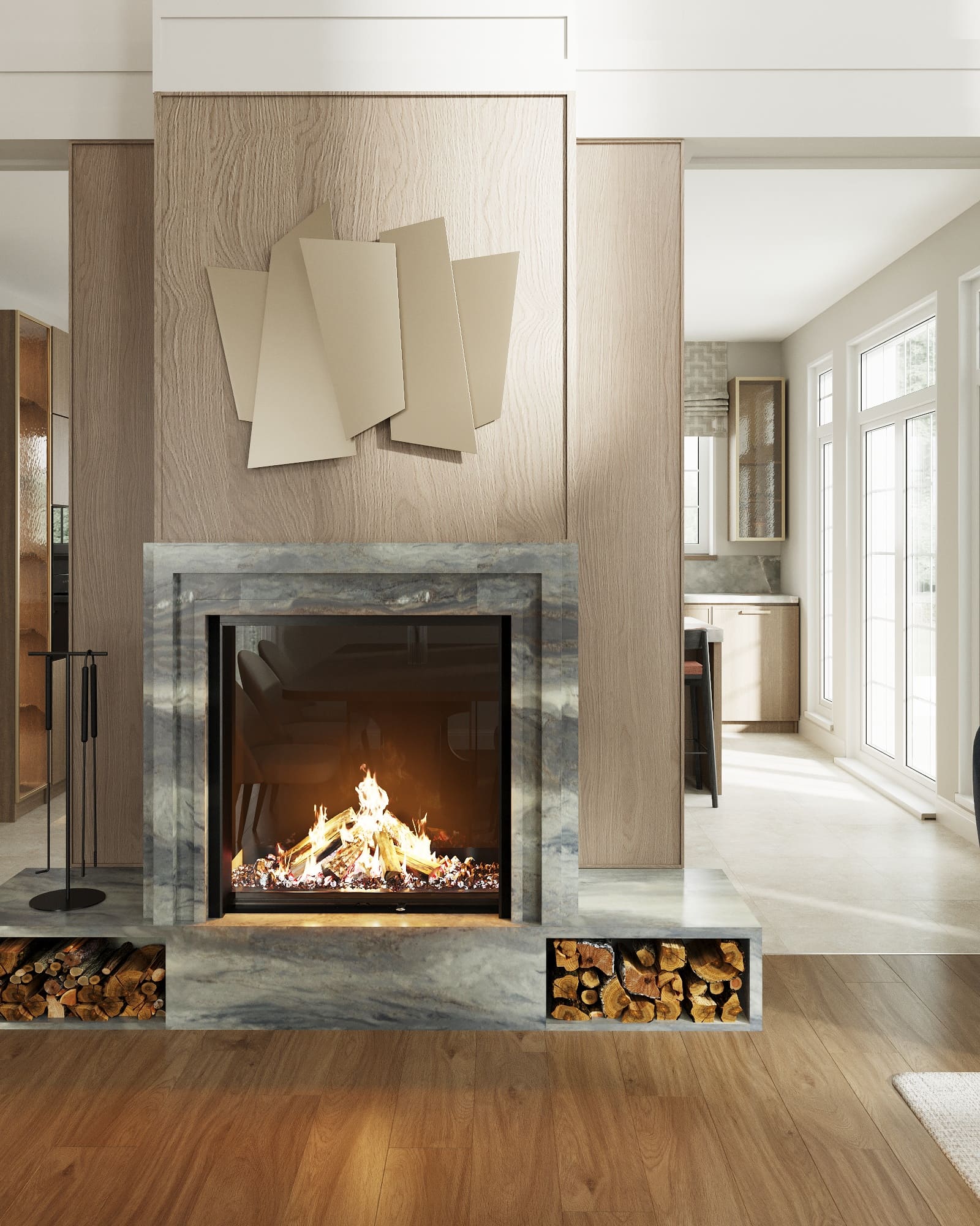 Цветовой и текстурный акценты сделаны на отделке камина, которая выполнена из серого мрамора, выделяющегося среди стен светло-серого оттенка и деревянной отделки пола и стен. Поэтому гостиная выглядит гармоничной и идеально подходящей для отдыха в уютной атмосфере.