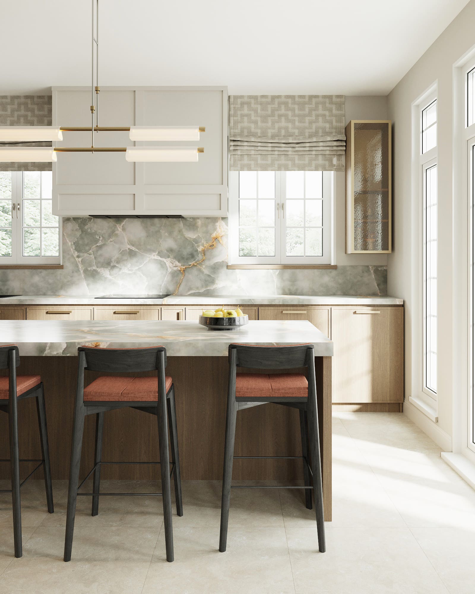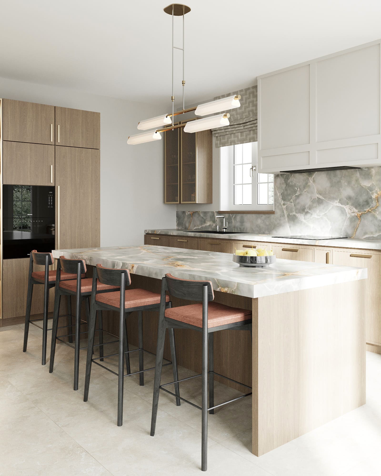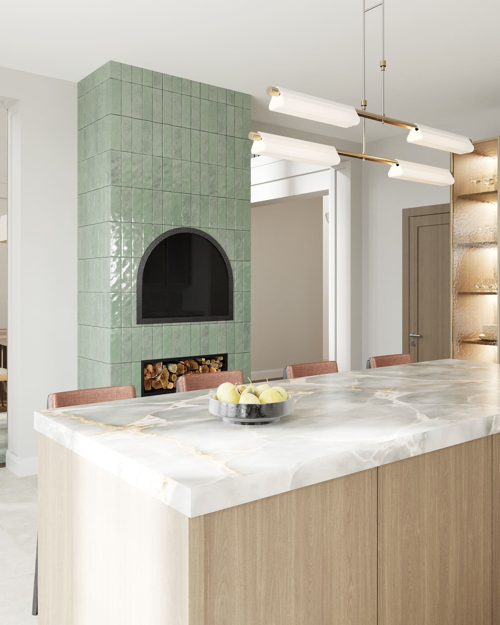 Кухня отделена от гостиной перегородкой с камином, в которой со стороны кухни встроена помпейская печь. Элегантная кухня с большим островом со столешницей из натурального светло-зеленого мрамора, двумя окнами по бокам от варочной панели и вытяжки и выходом на террасу, гармонично дополняет гостиную. Эта просторная кухня располагает готовить самые интересные блюда и так уютно проводить время вместе.