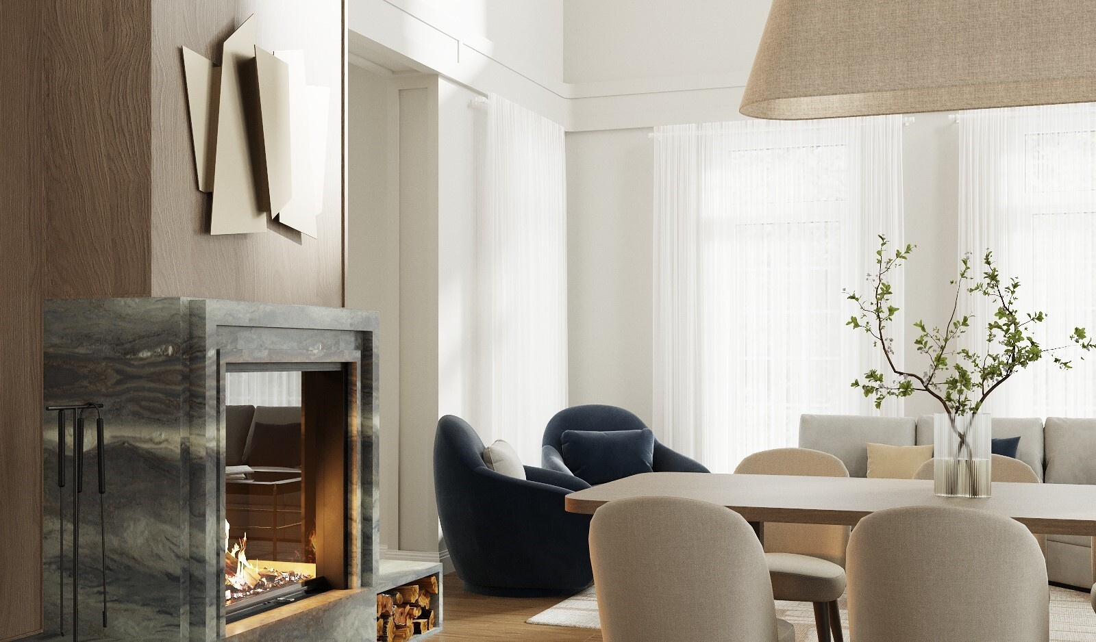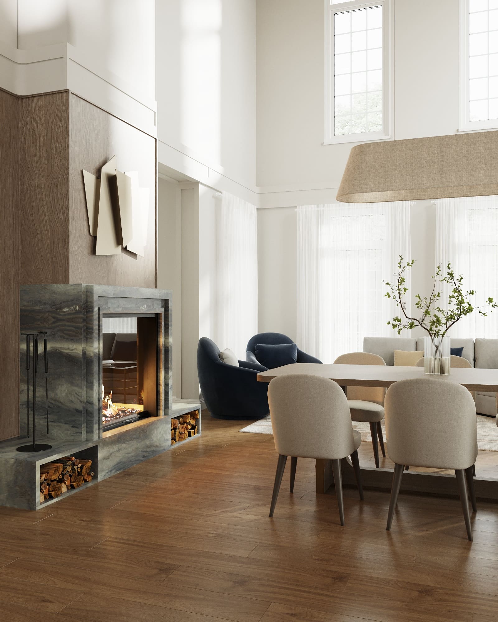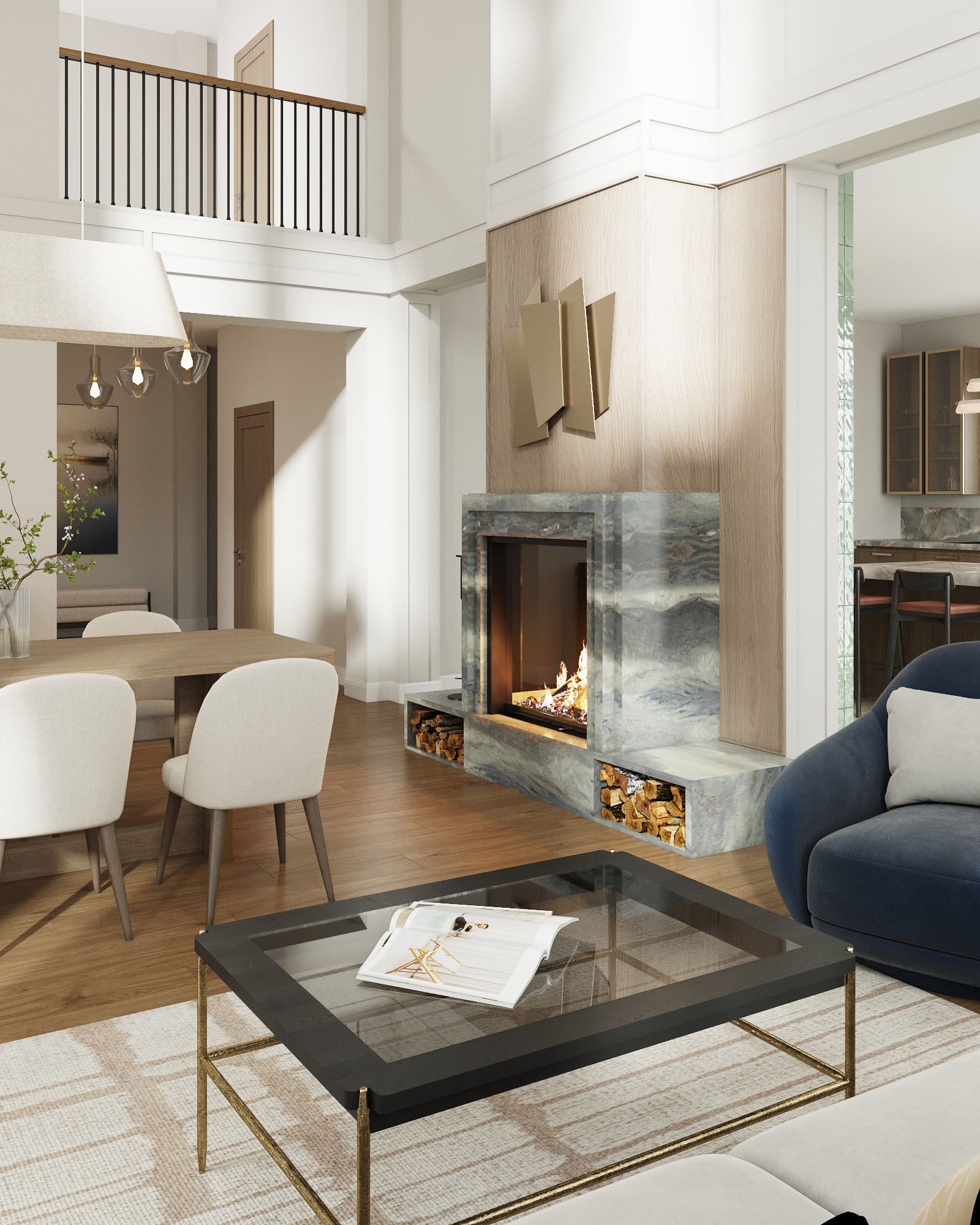 Просторная и светлая гостиная со вторым светом является сердцем дома, в котором расположились камин как центральная часть композиции, обеденная группа и мягкая зона с большими комфортным диваном и поворотными креслами.