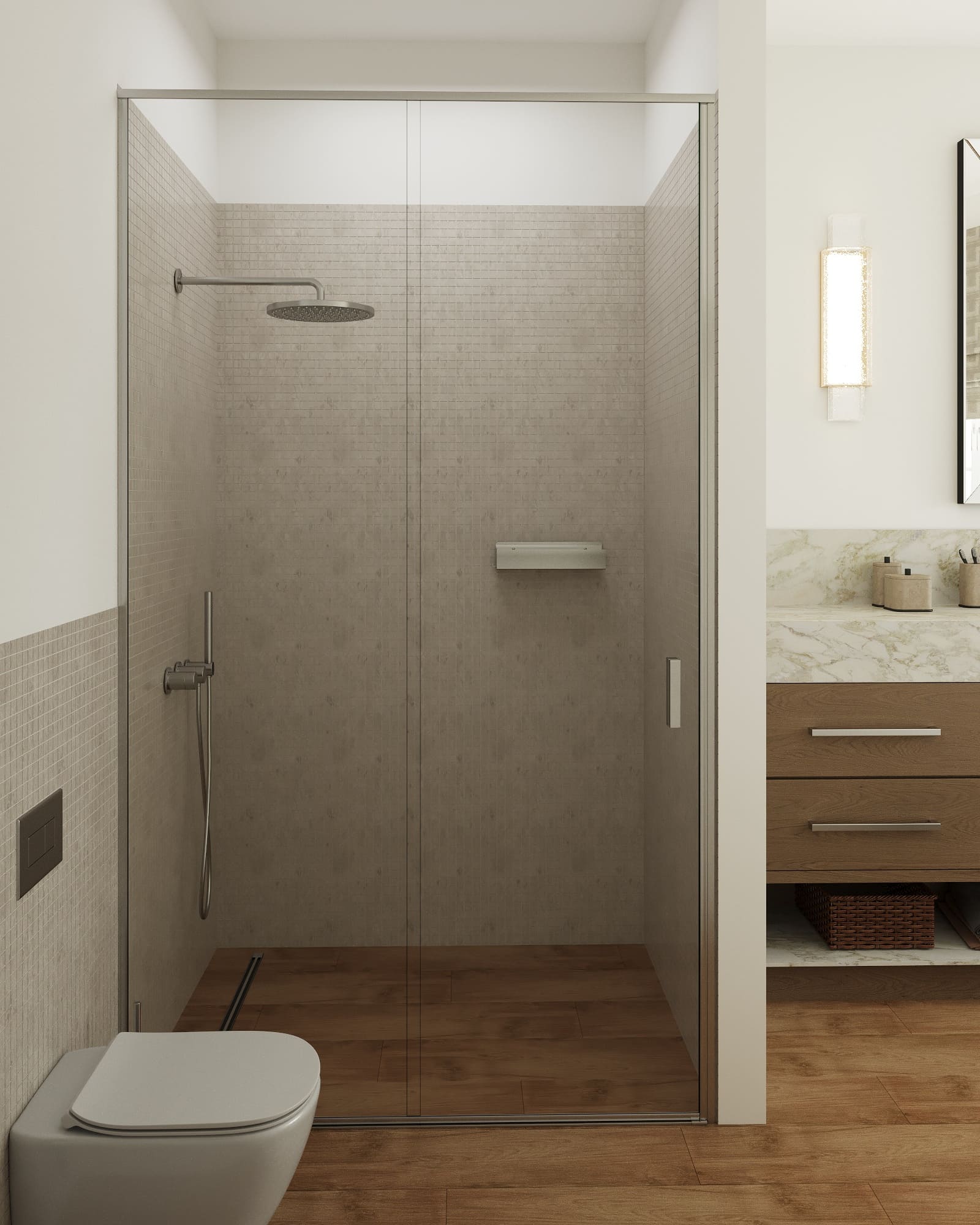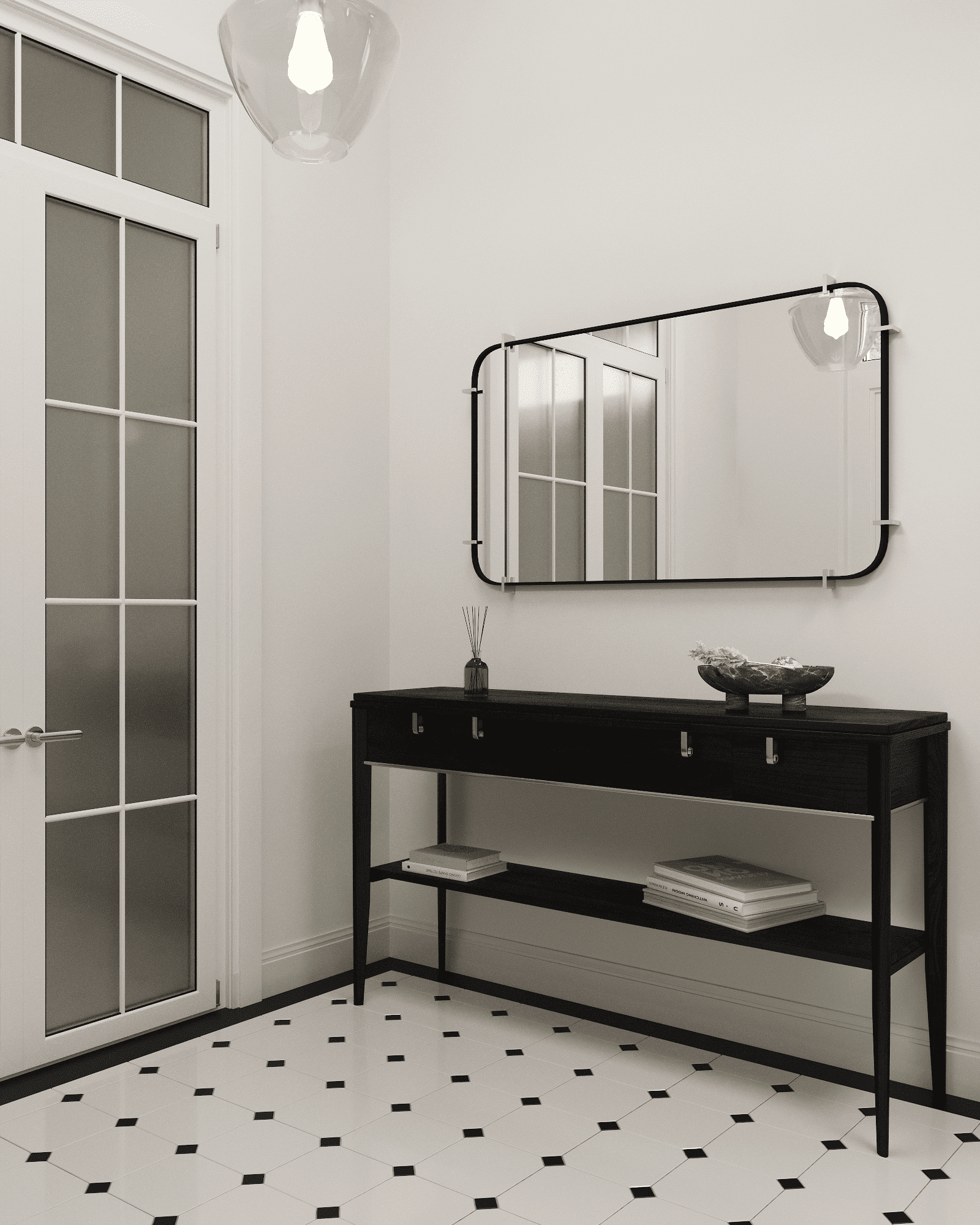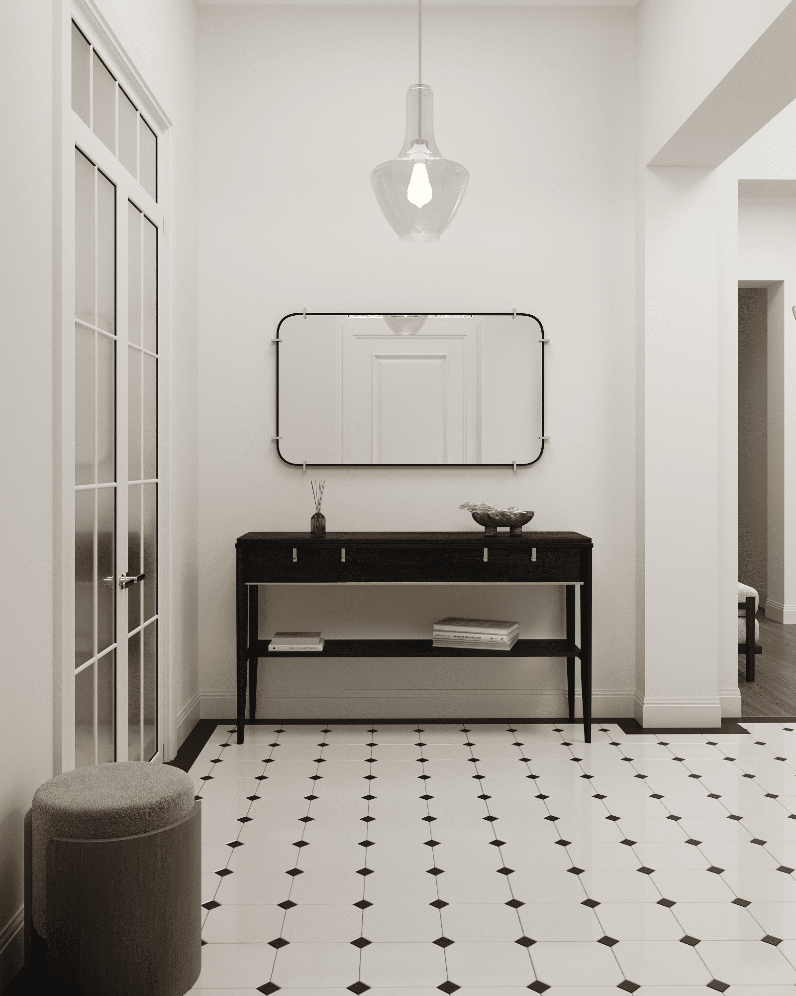 Просторный и светлый холл с традиционной метлахской плиткой на полу и изящной композиции из консоли и зеркала. Контраст светлого и темного, а также выраженная геометрия, составляют беспроигрышную основу интерьера входной группы.